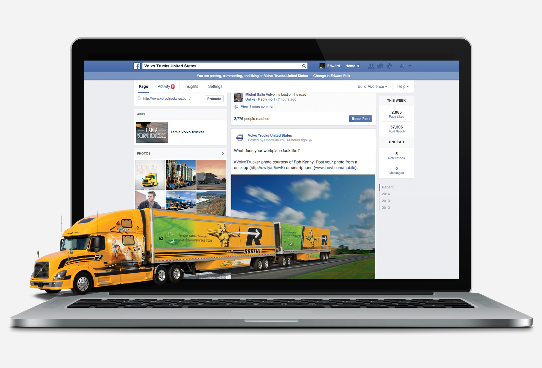 We made truckers the heroes of our page, featuring a Volvo truck online every morning before drivers took the road. These posts were driven by user-submitted photos, which drew huge engagement, positive conversation, and leads from drivers with competitive-brand trucks. Eventually, overwhelming submissions convinced us to launch a dedicated Facebook app, so drivers could submit photos of their own Volvo truck.